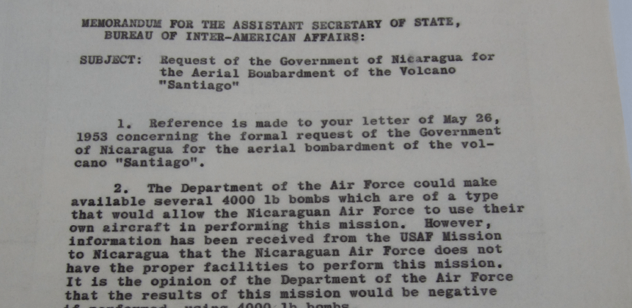The featured image shows archival material from 1950’s when discussions were held on the feasibility of bombing Masaya volcano’s active crater ‘Santiago’ to stop its persistent emissions.